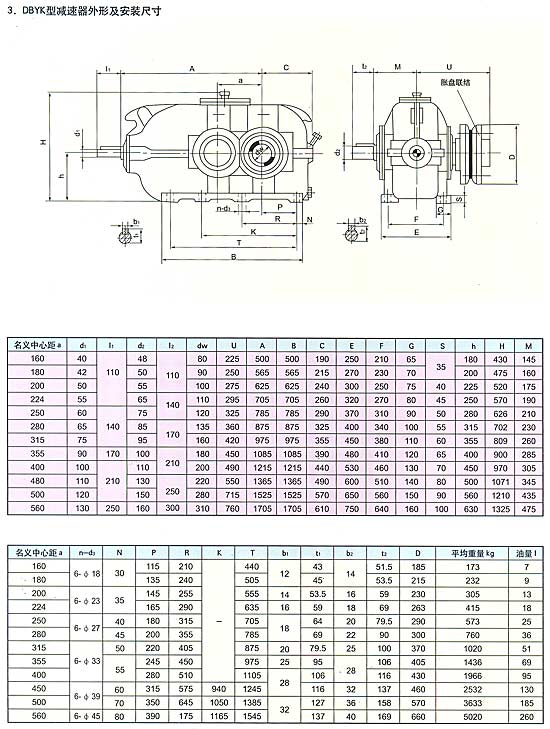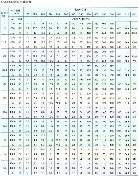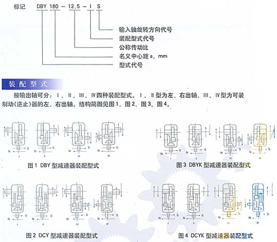 概述 圓錐圓柱齒輪減速器(以下簡稱減速器),用于輸入軸與輸出軸呈垂直方向布置的傳動裝置。主要用于帶式輸送機及各種運輸機械,也可用于煤炭、冶金、礦山、化工、建材、輕工、石油等各種通用機械的傳動機構(gòu)中。該產(chǎn)品具有承載能力高、噪音低、體積小、重量輕、效率高、使用壽命長等優(yōu)點。 型號標準 減速器的型號由型式代號,名義中心距a(末級中心距),公稱傳動比,裝配型式代號,輸入軸旋轉(zhuǎn)方向代號組成。 D一帶式輸送機類組代號,B一二級傳動,c一三級傳動,Y一硬齒面齒輪,z一中硬齒面齒輪,K一輸出軸為空心軸形式。 名義中心距:用實際數(shù)字表示,單位為mm。 傳動比:用公稱傳動比表示。 裝配形式:用羅馬數(shù)字l、ll、…、jV表示。 輸入軸的旋轉(zhuǎn)方向:面對輸入軸方向看,s為順時針方向,N為逆時針方向。