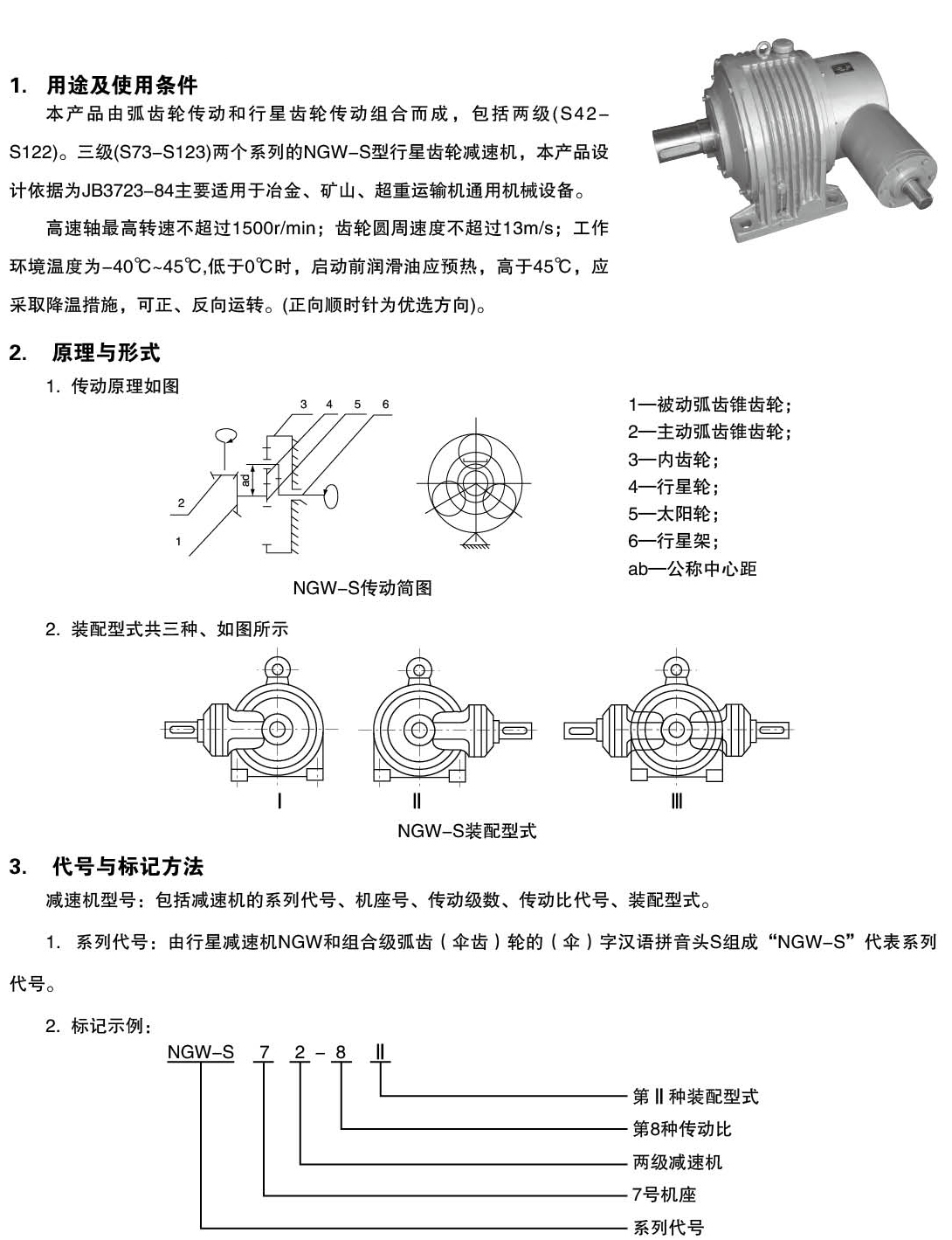 本產品由弧齒輪傳動和行星齒輪傳動組合而成,包括兩級(S42-S122)。三級(S73-S123)兩個系列的NGW-S型行星齒輪增速機,本產品設計依據為JB3723-84主要適用于冶金、礦山、超重運輸機通用機械設備。